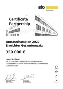 Für unseren erzielten Materialumsatz in Höhe von 350.000€ im Jahr 2022, bei unserem treuen und langjährigen Partner sto, erhielten wir diese tolle Auszeichnung „Umsatzchampion 2022„. Wir sind sehr erfreut und bedanken uns herzlichst für diese vertrauensvolle Partnerschaft.